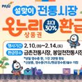 (중부시사신문) 파주시는 2026년 설 명절을 맞아 고물가로 인한 시민들의 가계 부담을 덜고 지역 전통시장 활성화를 도모하기 위해 ‘설맞이 농축산물 온누리상품권 환급 행사’를 실시한다. 이번 행사는 농림축산식품부가 주관하는 ‘농축산물 할인지원’사업의 일환으로, 본격적인 제수용품 구매 기간인ق월 10일부터 14일까지 5일간 관내 전통시장 2곳(봉일천전통시장, 금촌전통시장)에서 진행된다. 행사 기간 동안 참여 점포에서 국산 농축산물을 구매한 고객은 구매 금액에 따라 1만 원 또는 2만 원 상당의 온누리상품권을 환급받을 수 있다. 환급 기준은 ▲구매 금액이 3만 4천원 이상 6만 7천 원 미만일 경우 1만 원 ▲6만 7천 원 이상일 경우 2만 원이며, 환급 한도는 1인당 최대 2만 원이다. 단, 예산 소진 시 행사는 조기 종료될 수 있다. 환급을 희망하는 고객은 당일 구매 영수증과 신분증을 지참해 각 시장 내에 마련된 지정 환급처를 방문하면 된다. 환급 대상 품목은 국산 농산물 및 축산물이며, 수입산 농축산물이나 법인카드 결제 내역, 제로페이 모바일 상품권 결제 내역 등은 환급 대상에서 제외된다. 환급을