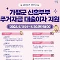 (중부시사신문) 가평군이 신혼부부의 주거비 부담을 줄여주기 위해 대출이자 지원에 나선다. 군은 ‘2026년 상반기 신혼부부 주거자금 대출이자 지원사업’을 실시하고, 오는 4월 1일부터 30일까지 신청을 받는다고 밝혔다. 신청은 거주지 읍면 행정복지센터를 방문하거나 경기도 일자리재단 통합접수시스템을 통해 가능하다. 이번 사업은 2025년 하반기(7월~12월)에 납부한 전세 또는 매입자금 대출이자를 대상으로 가구당 최대 150만원까지 지원하는 내용이다. 지원 대상은 가평군에 거주하는 혼인신고일 기준 7년 이내 신혼부부로, 기준 중위소득 200% 이하에 해당해야 한다. 군은 가평군 소재 주택의 전세 또는 매입 자금 용도로 금융기관에서 대출을 받은 약 100가구를 선정해 지원할 계획이다. 군 관계자는 “신혼부부 주거자금 대출이자 지원사업을 통해 주거 부담을 덜고 안정적인 지역 정착을 돕겠다”며 “앞으로도 신혼부부를 위한 다양한 혜택을 확대하는 방안을 지속적으로 마련하겠다”고 말했다.