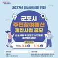 (중부시사신문) 군포시는 3월 4일부터 5월 15일까지 ‘2027년 예산편성을 위한 주민참여예산 제안사업’을 공모한다. 주민참여예산은 주민이 직접 사업 제안부터 편성까지 예산 全 과정에 참여함으로써 재정 운영의 투명성을 높이고 주민 만족도를 높일 수 있는 제도이다. 군포시민은 물론 관내 사업장 재직자 등도 사업을 제안할 수 있으며 ▲일상의 불편사항 해소를 위한 공익사업 ▲지역주민의 복리증진을 위한 사업 등 우리시에 도입하고 싶은 사업을 자유롭게 제안할 수 있다. 단, 정책결정 등 중장기 투자 사업, 대규모 계속 사업, 법정경비, 인건비 등은 신청대상에서 제외된다. 접수된 사업은 관련 부서에서 사업타당성 검토를 거쳐 구체화되고, 시민 위주로 구성된 주민참여예산 기구의 심의를 거쳐 최종적으로 수용된 사업이 2027년도 본예산으로 편성될 예정이다. 특히, 올해는 청년자율참여형 분야 신설, 주민참여예산 사업 관리카드 홈페이지 공개, 제안자 시장 표창 확대 및 인센티브 지급 등 다양한 개선책을 통하여 실질적 소통이 이루어지는 주민참여예산제를 운영하겠다는 것이 시의 설명이다. 공모에 참여하려면 동