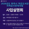 (중부시사신문) 파주시 중앙도서관은 지역의 작가, 예술가, 독서문화 활동가 등 인재를 발굴해 작은도서관의 독서문화 프로그램을 지원하는 녪년 작은도서관 지역강사 연계사업’에 참여할 지역강사를 모집한다. ‘작은도서관 지역강사 연계사업’은 2021년부터 추진하여 시민들이 작은도서관에서 지역의 작가, 예술가, 독서문화 활동가와 만나 다양한 독서문화 활동을 체험할 수 있도록 지원해 온 인기 사업이다. 특히 2025년에는 약 1,200명의 시민이 참여해 독서문화 확산과 작은도서관 운영 활성화에 크게 기여했다. 오는 28일 10시 중앙도서관에서 참여하고자 하는 강사들을 위해 모집 전 ‘강사 사업설명회’를 개최한다. 설명회에서는 사업 취지와 신청서 작성방법 등을 설명하여, 지역 작가, 예술가, 독서문화 등 다양한 역량을 가진 강사가 참여할 수 있도록 안내할 예정이다. 2026년도 지역강사 연계사업에 참여하여 강사로 활동하고자 하는 인재들은 오는 29일부터 2월 10일까지 신청서를 작성해 제출하면 된다. 또한, 2월 26일에는 서류심사를 통과한 강사를 대상으로 박람회 형식의 프로그램 설명회인 ‘지역강사박람회’를 금