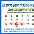 (중부시사신문) 파주도시관광공사는 12일, 2026년 설 명절을 맞아 시민과 고향을 방문하는 귀성객의 교통편의를 위해 공영주차장 24곳(부설주차장 시청, 의회, 금촌2-17 포함)을 오는 14일(토)부터 18일(수)까지 5일간 무료로 개방한다고 밝혔다. 설 연휴기간 동안 시민들이 안전하고 쾌적하게 주차장을 이용할 수 있도록 사전점검을 마쳤고 효율적인 인력 배치와, 비상연락 체계 유지를 통해 이용 불편을 최소화할 계획이다. 공사 조동칠 사장은 “시민들과 방문객의 주차 불편을 최소화하고, 안전한 시설관리를 통해 편안한 명절 연휴가 될 수 있도록 최선의 노력을 다하겠다”라고 말했다.