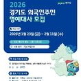 (중부시사신문) 경기도가 오는 2월 10일까지 ‘경기도 외국인주민 대사’ 20명을 모집한다. 2023년 경기도 외국인 안전문화 명예대사로 출발한 ‘경기도 외국인주민 명예대사’는 도내 이주민을 대표해 도정에 능동적으로 참여하고, 행정과 이주민 커뮤니티를 잇는 핵심 소통 창구 역할을 수행한다. 경기도 외국인주민 명예대사로 선정되면 임기는 2026년 3월부터 2027년 12월까지이다. 이주민 대표자로서 ▲도정 및 외국인주민 관련 시책 자문 및 모니터링 ▲정책 워크숍 및 주제별 역량강화교육 이수 ▲정책 제안서 작성 및 회의 참여 등의 활동에 참여하게 된다. 모집 대상은 경기도에 1년 이상 거주하고 있는 성인 외국인주민으로, 귀화자를 포함한다. 이민사회 정책에 관심을 가지고 지역사회에서 이주인권 관련 활동을 희망하는 사람은 경기도이민사회통합지원센터 누리집을 통해 제출 서류를 내려받아 2월 10일 오후 5시까지 전자우편으로 제출하면 된다. 도는 1차 서류심사와 2차 온라인 면접 심사를 통해 최종 합격자를 선발하고, 개별 안내할 예정이다. 윤현옥 경기도 이민사회정책과장은 “새롭게 위촉될 경기도 외국