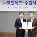 (중부시사신문) 수원특례시가 스마트팩토리 자동화시스템 전문 기업 ㈜코윈테크와 제24호 투자 협약을 체결했다. 수원시와 ㈜코윈테크는 10일 시청 상황실에서 협약을 체결하고, ㈜코윈테크가 수원에 R&D(연구&개발) 시설을 건립하는 데 협력하기로 했다. 협약식에는 이재준 수원특례시장, ㈜코윈테크 이재환 회장이 참석했다. 협약에 따라 ㈜코윈테크는 광교에 로보틱스 전담 R&D 시설을 추가 건립하는 등 적극적인 투자로 수원의 산업 발전을 위해 노력하기로 했다. 수원시는 건립 사업이 원활하게 이뤄지도록 행정·재정적 지원을 한다. 1998년 설립된 ㈜코윈테크는 스마트팩토리(지능형 생산공장) 선도 기업으로 국내외 배터리사에 이차전지 전체 공정 자동화시스템을 공급한다. 핵심사업은 물류 자동화 분야의 로봇·설비 제조다. 최근 AMR(자율이동로봇) 사업을 공격적으로 확대하고 있고, AMR 기술력을 자동차·반도체 등으로 확장할 계획이다. 특히, ESS(에너지 저장장치)분야의 모듈 조립 로봇과 AMR을 동시에 납품하는 등 올해 총 1000억 원 중반대 규모의 공급계약을 체결하기도 했다. ㈜코윈테크 이재환 회장은
