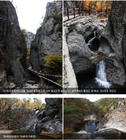 학소교를 건너면 거대한 협곡 사이로 들어선다. 철제다리를 따라 바위틈으로 걸어가는 길, 기암과 물줄기가 그려낸 풍광이 그저 신비롭기만 하다. 곧 제1폭포가 모습을 드러낸다. 가을 가뭄 때문인지 물줄기가 약하다. 선녀가 내려와서 목욕한다는 하트 모양의 선녀탕을 지나면 곧 제2폭포 갈림길이다.