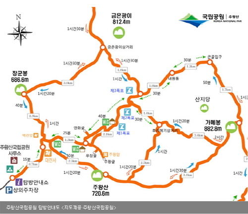 이번 주왕산 트레킹은 대전사에서 시작해 제1폭포(용추폭포)~제2폭포(절구폭포)~제3폭포(용연폭포)를 보고 돌아올 예정이다. 전기도 들어오지 않던 오지마을 내원동도 조금 걸어볼 참이다. 남녀노소 모두 무리 없이 걸으며 폭포와 단풍으로 물든 주방천을 감상할 수 있는 길이다.