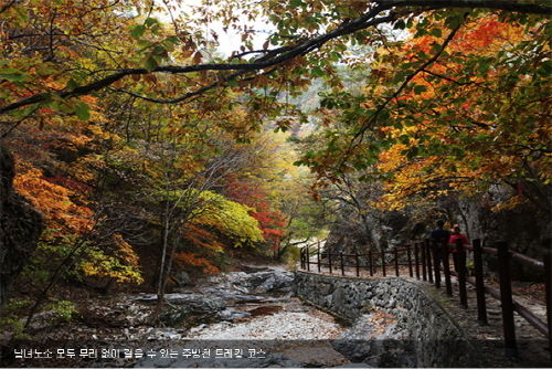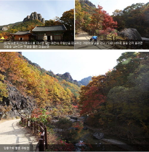 대전사를 지나 주방천을 따라 걷는 길. 가을 가뭄에 물길은 약하지만 알록달록 물든 단풍만은 어김없이 탐방객들을 반겨준다. 언제까지고 걷고 싶은 길이다. 다리 사이로 돌을 던지면 아들을 낳는다는 전설을 품은 아들바위도 재미를 더한다.