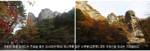 주왕산 상의매표소 주차장에 내리면 좁은 길을 따라 이어진 산자락 음식점들은 청명한 하늘과 기암을 병풍삼아 사람들을 맞는다. 주왕산의 상징이자 수문장으로 알려진 기암(旗岩)은 옛날 당나라 주왕이 깃발을 세웠다는 전설을 품고 있다. 트레킹을 시작하기 전 주왕산에 얽힌 전설부터 들어보자. 주왕은 중국 당나라때 진나라 재건을 위해 반역을 일으킨 주도로 알려진다. 반역은 실패했고 주도는 쫓기고 쫓겨 신라 땅까지 들어서게 된다. 이에 당나라는 신라에 그를 잡아달라고 요청했고 신라 마일성 장군은 주왕굴에 숨어있던 주도를 잡아낸다.