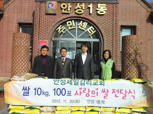 안성시 동본동에 소재한 안성 제일감리교회(담임 목사 김형석)에서는 지난 11월 20일 지역의 어려운 이웃을 돕기 위하여 그동안 교인들 한분 한분이 모은 사랑의 쌀(10kg) 100포를 안성1동 주민자치센터에 전달하였다.