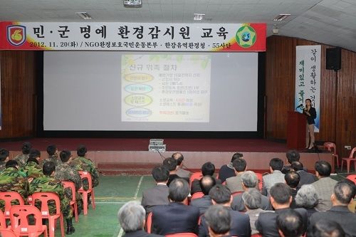 육군 제55보병사단은 지난 20일 사단 봉화관에서 NGO 환경호보 국민운동 총본부, 한강유역 환경청과 공동주관으로 사단장(박원수 소장)을 비롯해 환경호보 국민운동 총본부장, 환경관리국장, 경기지역 교장단 등 민․군 환경관계자 180여명이 참석한 가운데 민․군 명예 환경감시원 교육을 실시했다.
