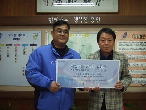 삼성에버랜드는 3일 포곡읍사무소를 방문하여 장태영 포곡읍장에게 난방유 12,000리터 (1,800만원 상당) 상당의 교환권을 전달하였다.