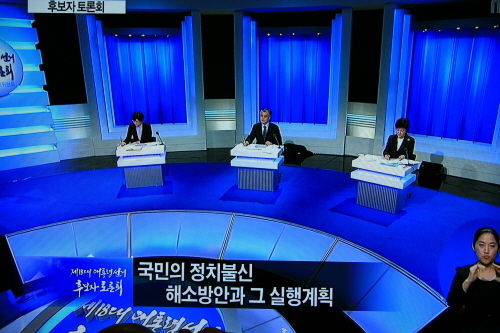 중앙선거관리위원회가 주최하는 18대 대선 첫 TV토론이 4일 저녁 8시부터 2시간동안 진행됐다. 토론에 나선 박근혜 새누리당 후보, 문재인 민주통합당 후보, 이정희 통합진보당 후보는 기조연설과 국민질문에서 자신이 준비해온 비전과 정책을 설명하면서 날을 세우기 시작했다.
