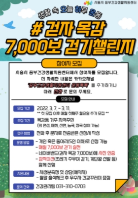 (중부시사신문) 시흥시보건소 중부건강생활지원센터에서는 걷기 생활화로 지역주민들이 건강을 챙길 수 있도록 ‘걷자 목감 7,000보 걷기 챌린지’를 추진한다.