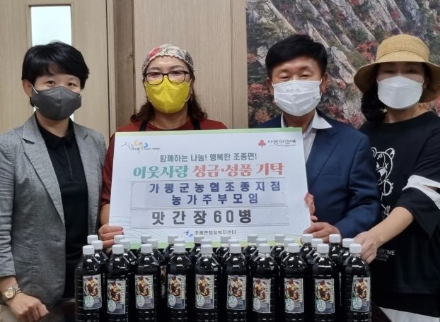 (중부시사신문) 가평군 농협 조종지점 농가주부모임은 지난 29일 조종면행정복지센터를 방문하여 관내 취약계층을 위한 맛간장 60병을 기탁했다.