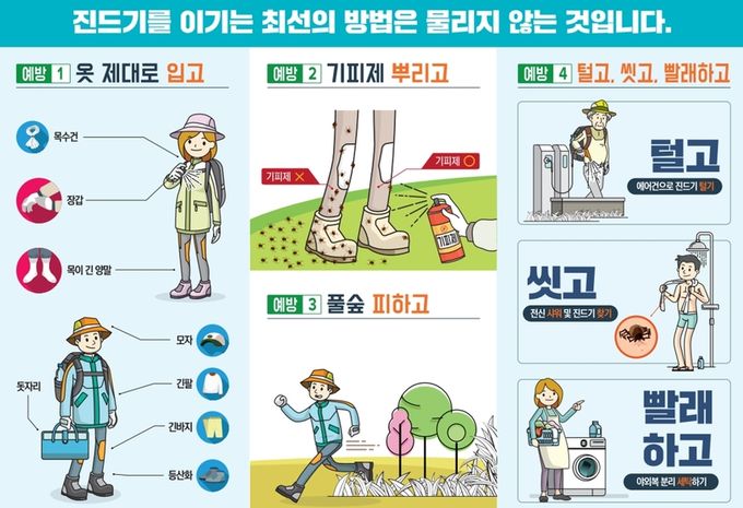 보건소 관계자는 “야외활동 시에는 긴팔, 긴 바지, 장화 등을 착용해 진드기로부터 몸을 보호하도록 주의해야 한다. 진드기감염병은 예방백신이 따로 없기 때문에 진드기에 물리지 않는 것이 가장 중요하다”고 강조했다.