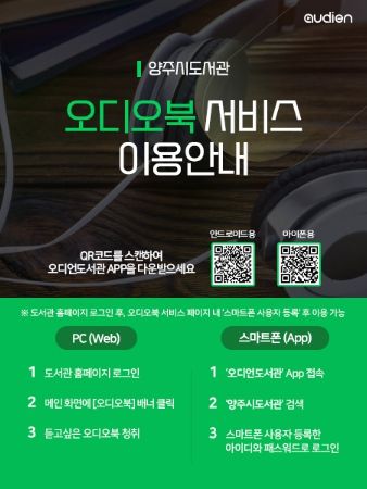 오디오북 서비스를 희망하는 시민은 도서관 홈페이지에서 읽고 싶은 오디오북을 검색해 실시간 스트리밍으로 이용하거나 홈페이지에서 ‘스마트폰 사용자 등록’ 후 오디오북 전용 앱 ‘오디언 도서관’을 설치하면 스마트폰으로 오디오북을 이용할 수 있다.