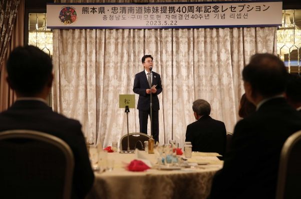 리셉션에는 김태흠 지사와 최원철 공주시장, 박정현 부여군수, 박범인 금산군수, 도의회 양경모 의원 등 충남도 일본 방문단, 가바시마 이쿠오 지사를 비롯한 구마모토현 관계자 등 100여 명이 참가했다.