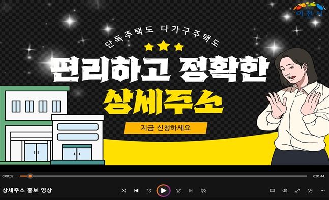 이천시는 지난 21일 자체제작 홍보 영상을 통해 상세주소의 개념 및 신청대상, 신청방법, 필요성 등을 알리고, 상세주소가 없는 건물의 소유자·임차인의 상세주소 신청을 적극 독려하고 있다.