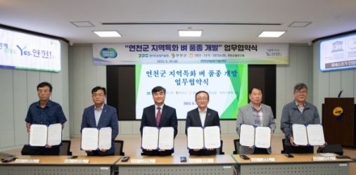 (중부시사신문) 연천군농업기술센터는 30일 센터 대강당에서 경기도농업기술원, 연천·전곡·임진농협, 연천군쌀연구회와 ‘연천군 지역특화 벼 품종 개발을 위한 업무협약’을 체결했다.
