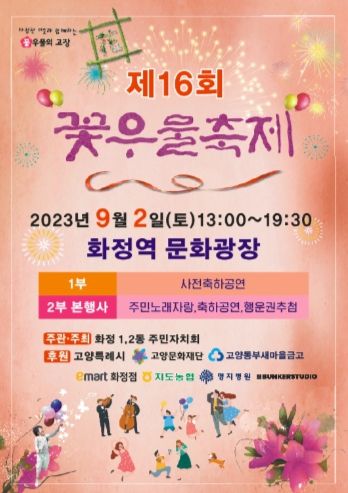 (중부시사신문) 고양특례시 화정1·2동 주민자치회는 오는 9월 2일 화정역 문화광장(덕양구 화정동 971)에서 주민 화합을 위한 ‘제16회 꽃우물 축제’를 개최한다.