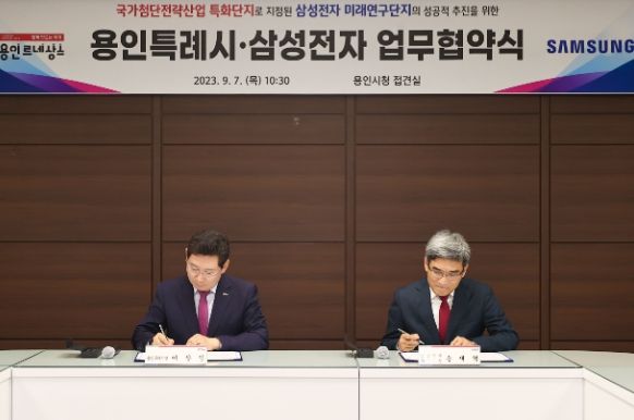 (중부시사신문) 용인특례시는 7일 삼성전자와 국가첨단전략산업 특화단지로 지정된 기흥캠퍼스(122만 5000㎡, 37만여 평) 내 ’미래연구단지(10만 9000㎡, 3만3000여 평)‘의 성공적 조성을 위한 업무협약을 체결했다.