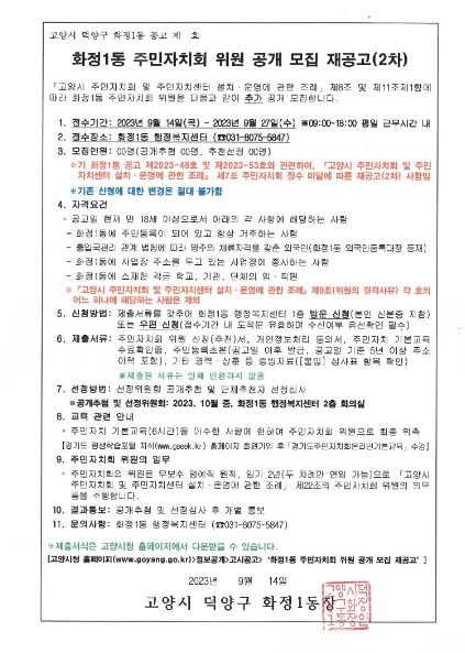 (중부시사신문) 고양특례시 화정1동 행정복지센터는 마을 발전을 주도할 주민자치회 위원을 9월 14일부터 9월 27일까지 추가 공개 모집 중이라고 밝혔다.