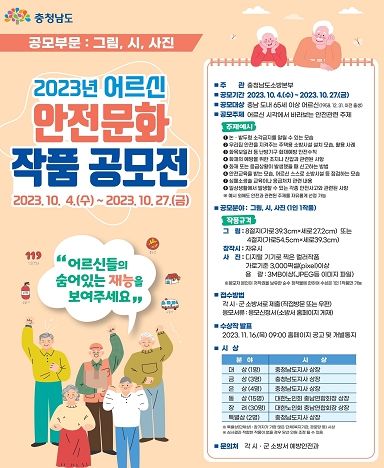 참가 자격은 충남도에 주소를 둔 65세 이상 어르신이면 누구나 참가할 수 있으며, 약 3개월 간 홍보기간을 거친 후 오는 10월 4일부터 10월 27일까지 응모신청서와 출품작을 소방서에 방문 또는 우편으로 제출하면 된다.
