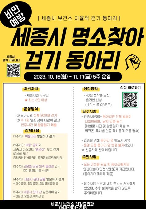 (중부시사신문) 세종특별자치시보건소가 시민의 비만 예방 및 건강증진을 위해 ‘세종 명소 찾아 자율적 걷기 동아리’를 운영하기로 하고, 활동에 참여할 동아리 40팀을 오는 11일까지 선착순 모집한다.