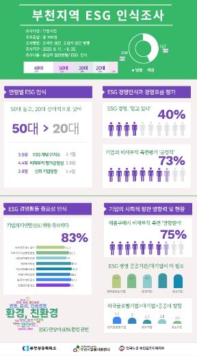 부천지역 성인남녀 총 366명을 대상으로 8월 11일부터 25일까지 진행한 이번 조사에서 응답자의 40%는 ESG 경영에 대해 알고 있고, 73%는 기업의 비재무적 측면을 평가하는 흐름에 긍정적이며, 83%는 기업의 다양한 ESG 활동이 중요하다고 인식하는 것으로 나타났다.