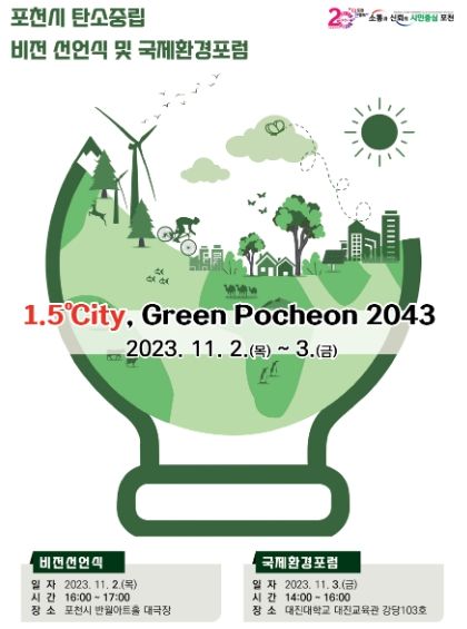 탄소중립 비전 선언식과 국제환경포럼은 지난 「대한민국 지방정부 기후적응 선언」에 동참에 따라 ‘1.5℃ity, Green Pocheon 2043’ 비전 슬로건으로 마련됐다.