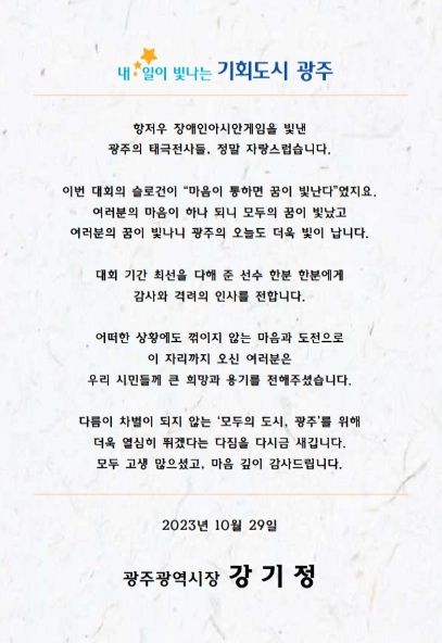 한편 강기정 시장은 항저우 장애인아시안게임에 출전한 9개 종목 20명의 광주시 소속 선수들에게 응원의 격려 카드를 보냈다. 또 대회에서 메달을 획득한 선수들에게 “선수들 곁에 광주시민이 있고 시장이 있다”며 “여러분이 자랑스럽고 고맙다. 건강한 모습으로 귀국해서 만나자”는 축하메시지를 전했다.