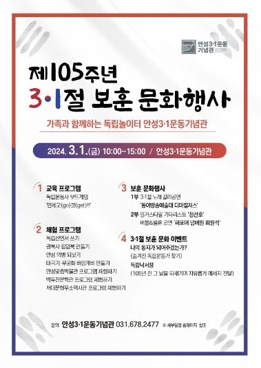 (중부시사신문) 안성시 안성3·1운동기념관은 3·1절 행사를 맞아 ‘제105주년 3·1절 보훈 문화행사-가족과 함께하는 독립놀이터 안성3·1운동기념관-’ 행사를 개최한다고 밝혔다.