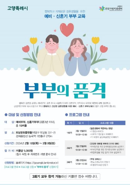 (중부시사신문) 고양시 건강가정지원센터에서는 예비‧신혼기 부부 교육인 ‘부부의 품격’을 오는 3월 16일 및 23일 양일에 걸쳐 토당 문화 플랫폼에서 진행한다.