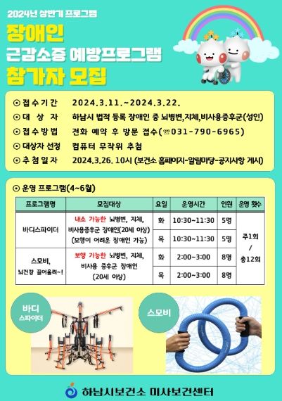시 관계자는 “장애인의 근감소증 예방의 중요성을 알리고, 양질의 재활서비스를 제공함으로써 장애인의 자가 건강관리 능력이 향상될 것으로 기대한다”고 전했다.