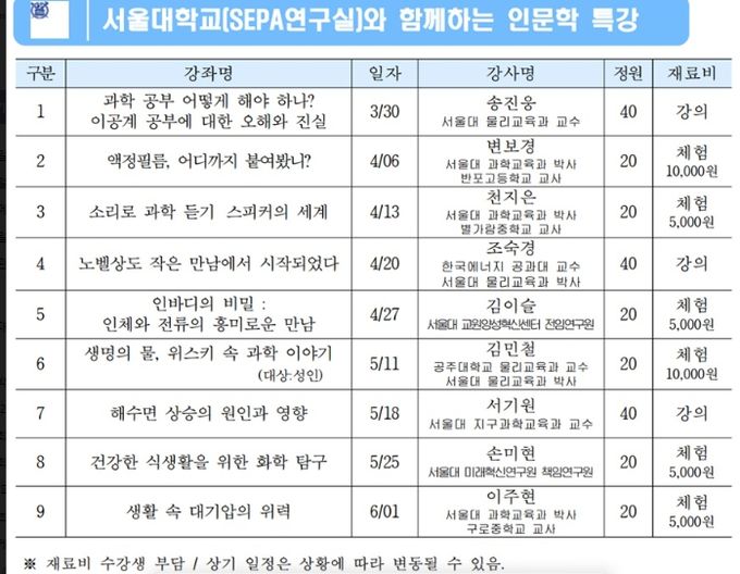 체험형 방식은 △'액정필름, 어디까지 붙여봤니?'(4월 6일) △'소리로 과학 듣기! 스피커의 세계'(4월 13일) △'인바디의 비밀: 인체와 전류의 흥미로운 만남'(4월 27일) △(성인 대상) '생명의 물, 위스키 속 과학 이야기'(5월 11일) △'건강한 식생활을 위한 화학 탐구'(5월 25일) △'생활 속 대기압의 위력'(6월 1일) 등 6개 과정이 마련됐다.