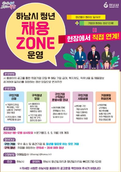 앞서 하남시는 청년 채용 ZONE에 참가할 우수 기업의 참여를 위해 하남시 홈페이지에 2월 1일부터 2월 29일까지 공고문을 게재하고, 중소기업중앙회와 고용노동부 등 중앙기관을 활용해 적극적인 기업참여를 유도했다.