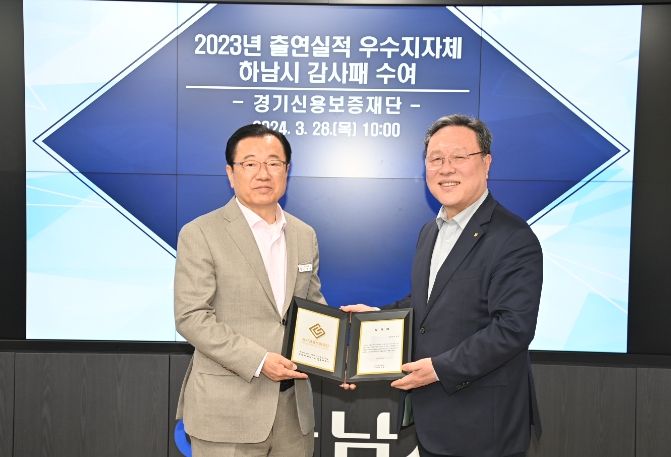 29일 하남시에 따르면 경기신보는 지난 28일 고금리와 고물가, 경기침체로 힘든 시기를 보내고 있는 중소기업과 소상공인 지원을 위해 적극 출연한 하남시를 3년 연속 출연 우수지자체로 선정하고, 감사패를 수여했다.