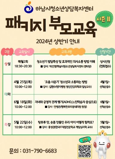 패키지 부모교육은 하남시 관내 청소년 부모 및 보호자 대상으로 진행되며, 매월 동일한 주제로 진행되는 “상설 부모교육”과 분기별로 다양한 주제로 진행되는 “테마 부모교육” 및 “부모교육 특강”으로 나눠 실시된다.