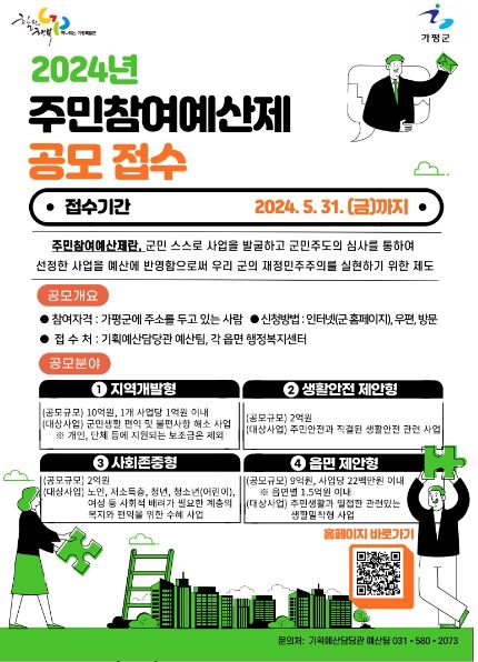 (중부시사신문) 가평군은 주민이 직접 제안한 사업을 2025년도 예산에 반영하는‘주민 참여예산 제안 사업공모’를 오는 5월 31일까지 접수한다.