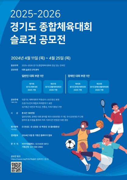 군 관계자는 “경기도 종합체육대회 가평개최는 3번의 도전 끝에 이뤄낸 희소식이자 성과로 그간 대회 추진단 신설, 민간추진단 발족, 학교시설 개방 협약, 숙박 및 외식업체 동참 약속 등 민·관이 대회 준비에 발빠른 움직임을 이어가고 있다”며 “이번 공모 당선작은 본 대회 슬로건으로 사용되는 만큼 대회 의미가 잘 표현된 좋은 작품이 많이 나오길 기대한다”고 말했다.