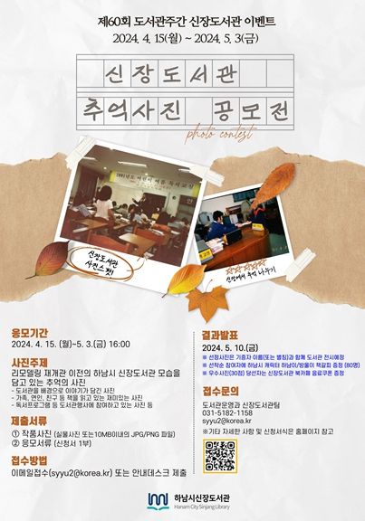 17일 하남시에 따르면 시는 신장도서관이 개관한 해인 1996년부터 리모델링으로 재개관한 2020년까지 신장도서관을 배경으로 찍은 사진 또는 도서관 이용 모습이 담긴 사진을 오는 5월 3일까지 공모한다.