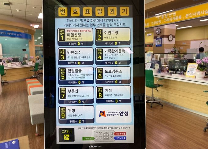 이번에 안성시에 설치한 통합 순번대기 시스템은 키오스크 순번 발행기에서 여권, 주민등록, 가족관계, 부동산, 지적 등 9개 업무에 대해서 통합으로 번호표를 발행한 후 대기인 수를 안내하고 각 창구에서 음성으로 호출하는 방식이며, 민원실 2개 출입구에 정면으로 보이도록 설치하여 접근이 용이하다.