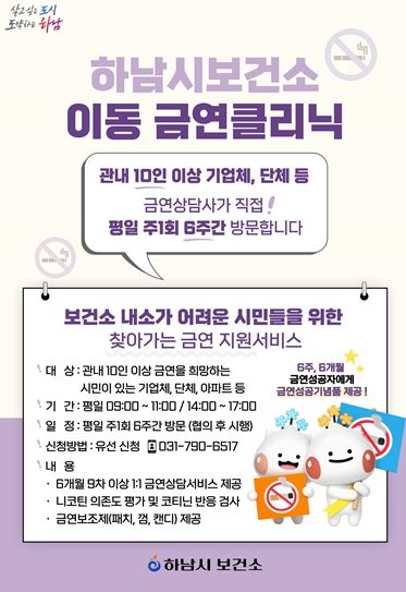 ‘찾아가는 이동 금연클리닉’은 금연희망자가 10명 이상이고, 상담을 진행할 수 있는 장소를 갖춘 지역 내 기업체·단체·아파트 등 기관이라면 어디든 신청할 수 있다. 참여를 희망하는 기관은 하남시보건소 만성질환관리팀으로 전화해 신청하면 된다.
