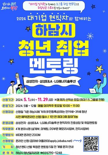 (중부시사신문) 하남시가 5월 1일부터 총 8회 걸쳐 운영하는 ‘청년 취업멘토링’에 삼성전자와 삼성E&A, LG에너지솔루션 등에서 근무하는 현직자가 함께 참여한다.
