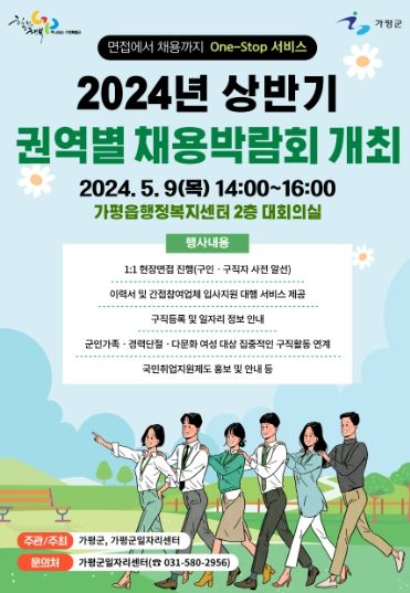 ‘2024년 상반기 권역별 채용박람회’는 ▲5월 9일 가평읍·북면을 시작으로 ▲5월 23일 상면·조종면 ▲6월 13일 설악면·청평면 총 3회의 걸쳐 권역별로 개최된다. 취업상담, 이력서 작성 및 취업관련 정보를 실시간으로 제공해 관내 취업취약계층 구직자들에게 안정적인 일자리 연계가 이루어질 것으로 기대된다.