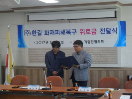 고삼면 기업인협의회(회장 노한영)는 지난 17일 기업인협의회를 열어 대형화재로 피해를 입은 ㈜한길조경(대표 유창호, 고삼면 쌍지리)에 기업인협의회의 뜻을 모아 위로금을 전달하였다.