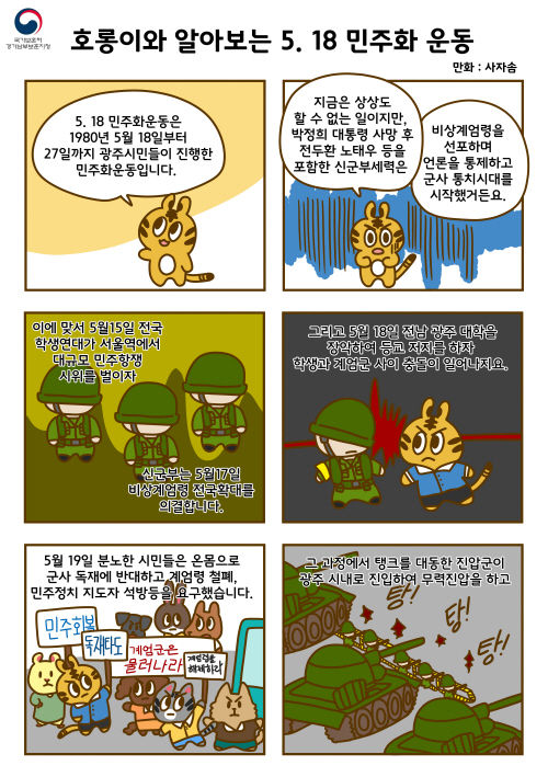 경기남부보훈지청(지청장 남창수)에서는 나라사랑 앞섬이와 함께 호국정신과 나라사랑 함양을 위한 교육자료로서 월별 나라사랑 웹툰(호롱이와 함께하는 나라사랑 이야기)을 제작하였다. 5월 이달의 웹툰은 5.18 민주화운동에 대한 주제로 약 11컷분량의 카툰으로 구성되어있다.
