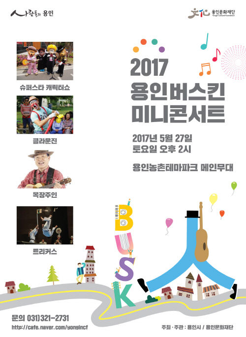 보다 많은 용인시민이 관람할 수 있도록 전 공연 무료로 진행되는 2017년 용인버스킨 ‘찾아가는 미니콘서트’는 4월부터 11월까지 총7회에 걸쳐 처인구, 기흥구, 수지구 곳곳으로 찾아가 다양한 공연과 함께 체험프로그램을 마련해 용인시민을 찾아갈 예정이다.