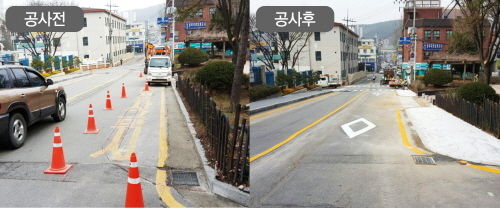 이에 구는 처인어린이공원 도로 90m구간에 인도와 횡단보도 등을 설치해 보행 안전을 확보하고, 인도를 설치할 수 없는 구간은 기존 차선폭을 조정하여 보행공간을 마련했다.