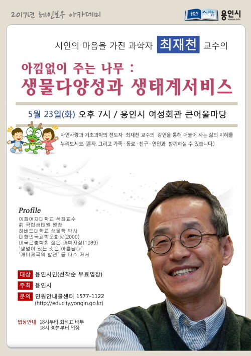 용인시는 시민을 위한 교양강좌인 ‘레인보우아카데미’의 올해 세 번째 특강으로 생물학자인 이화여대 최재천 석좌교수가 오는 23일 오후 7시 수지구 풍덕천동 여성회관에서 강연을 한다고 밝혔다.
