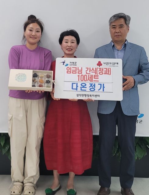 (중부시사신문) 가평군 다온정가는 어버이날을 맞아 혼자 사시는 어르신께 전달해 달라며 지난 7일 손수 만든 300만원 상당의 임금님 간식(수제정과 9종) 100세트를 설악면행정복지센터에 기탁했다.